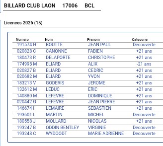 licenciés 2025/2026 en cours Licences 2025/2026 liste en cours 15 au 31décembre Catégorie : licences - Licences saison saison 2018/2019 saison 2020/2021 saison 2021/2022 saison 2022/2023 saison 2023/2024 saison 2024/2025 saison 2025/2026 Prévisualiser... Imprimer...