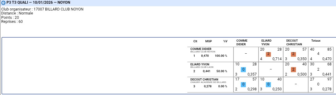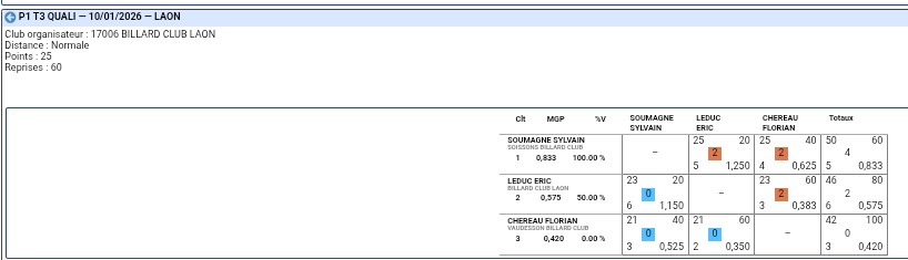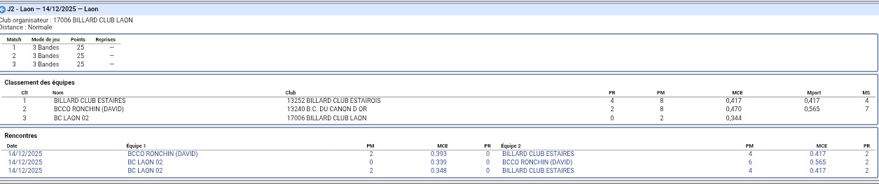 Nouvelles Poster une nouvelle Journée 3 - CDF 3 BANDES 01 février 2026 à domicile Tour 3 - BANDE 31 janvier 2026 Yvon Reg 1 et Cédric Nat 3 Finale Aisne - CADRE 25 janvier 2026 Cédric Champion de l'Aisne Cadre Nationale 3 Finale Aisne. LIBRE 18 janvier 2026 Sébastien champion Aisne en Reg 1 Yvon 3e Cédric 3e Christophe 6e en Reg 3 Journée 3 - CDF JEUX de SERIE 11 janvier 2026 en déplacement à ESTAIRES (Nord) Victoire sur Meru Défaite contre Estaires Tour 3 - 3 BANDES 10 janvier 2026 1 victoire pour Eric 1 victoire pour Yvon Journée 2 - CDF 3 BANDES 14 décembre 2025 à domicile. 2 défaites contre Ronchin et Estaires tour 3. LIBRE 13 decembre 2025 0 victoire pour Cédric Qualifié 1 victoire pour Yvon Qualifié 0 victoire pour Sébastien Qualifié 2 victoires pour Christophe Qualifié Tour 3- CADRE 23 novembre 2025 2 victoires pour Cédric1 victoire pour Yvon Journée 2 - CDF JEUX de SERIE 23 novembre 2025 à domicile [ 1 2 3 4 5 6 7 8 9 10 ]
