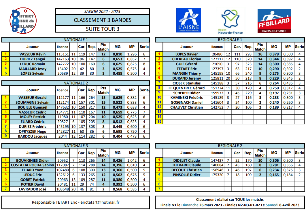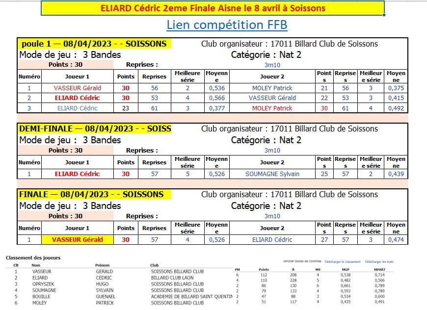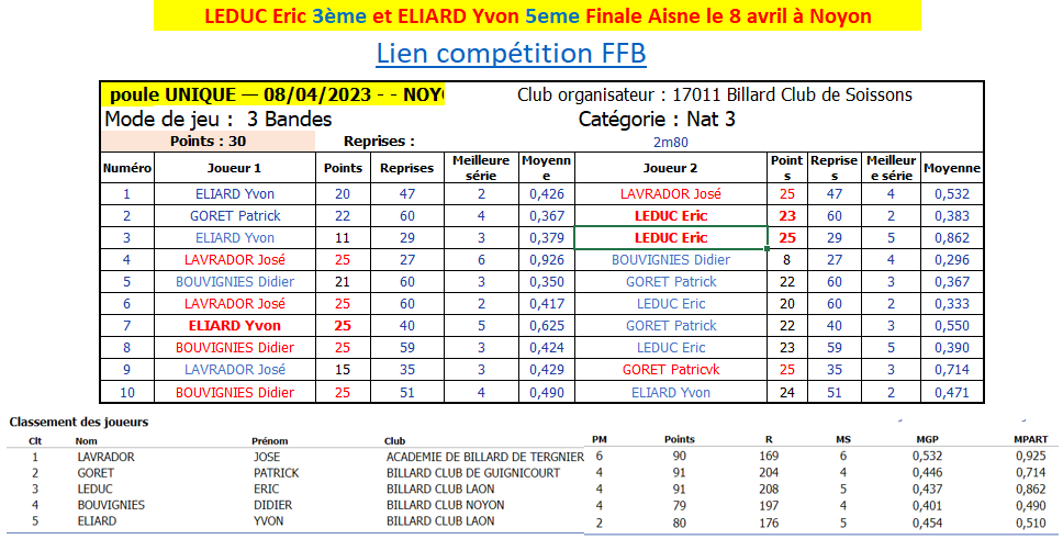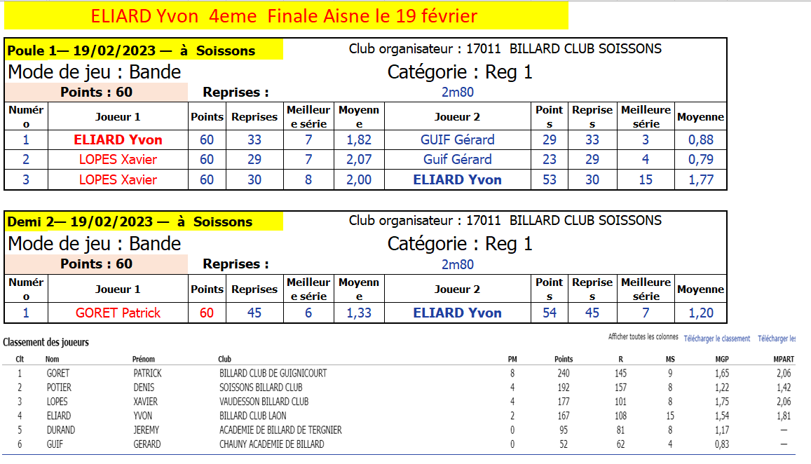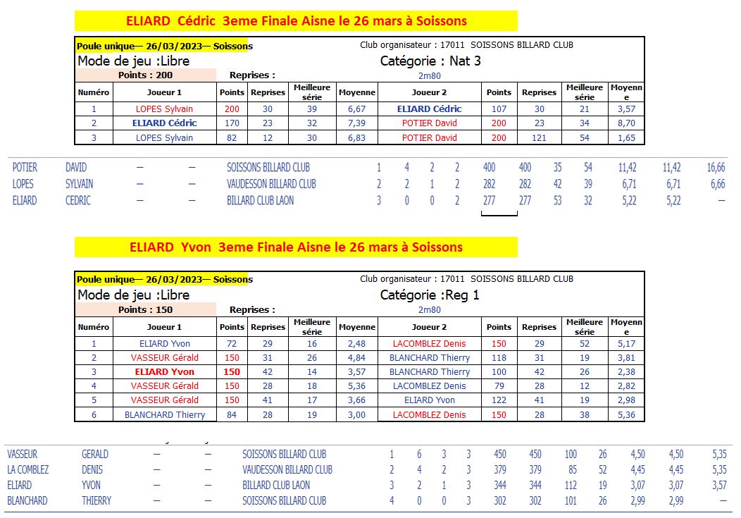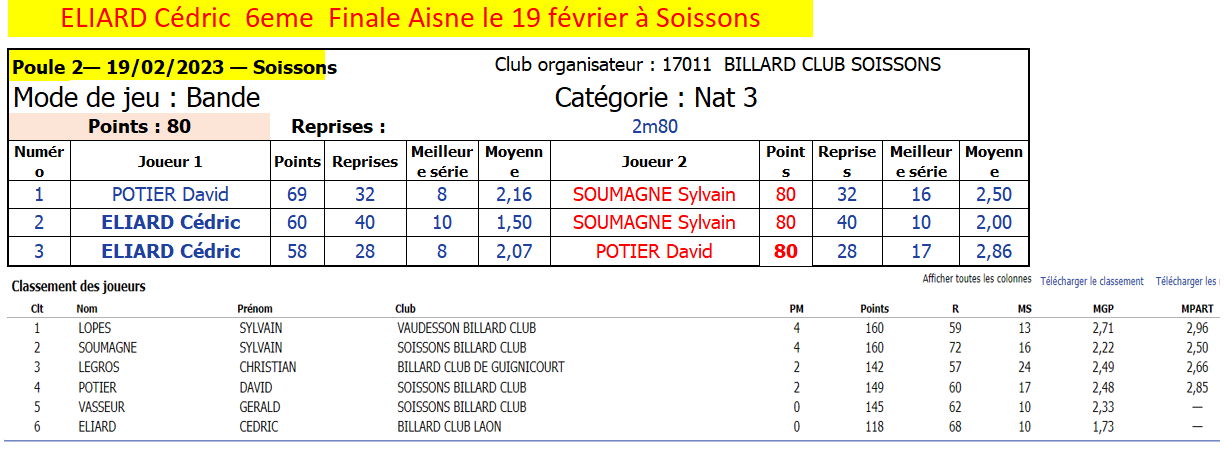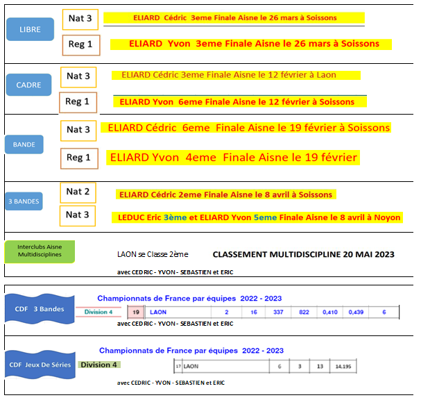 Nouvelles Poster une nouvelle Forum Associations le club présent au forum des associations pilote par France Benevolat le Samedi 9 septembre 2023 Extraits AG 2023/2024 Extraits Bilan Saison 2022/2023 Multidisciplne Laon 2ème 3 BANDES - Finales Aisne le 8 AVRIL 2023 CDF JDS - J3 - 2 avril Dimanche 2 avril LAON bat LE TOUQUET et nul avec BEAUVAIS 2 LIBRE - Finales Aisne le 26 mars Cédric et Yvon 3ème de leur Finale Aisne à SOISSONS CDF 3 Bandes - dernier tour le 12 mars 3 Bandes - dernier tour le 11 mars Finales N2-N3-R1-R2 Le Samedi 8 Avril 2023 Cédric, Yvon et Eric qualifiés bravo ! BANDE - Finales Aisne résultats le 19 février [ 1 2 3 4 5 6 7 8 9 10 ]