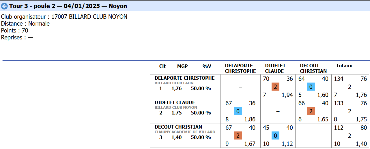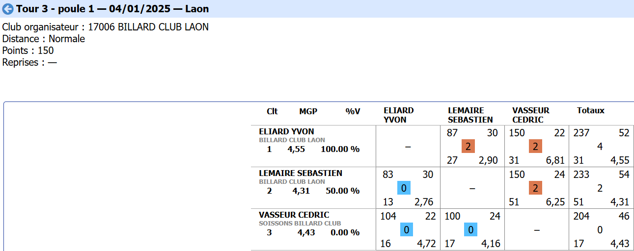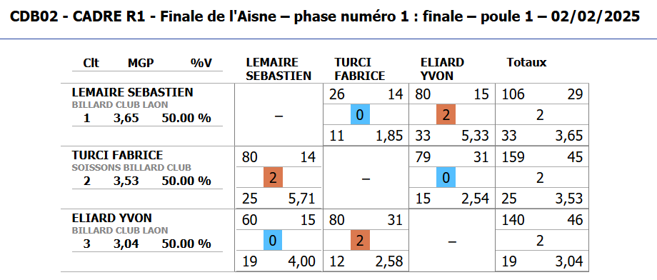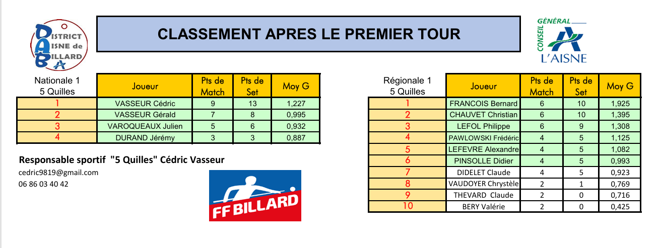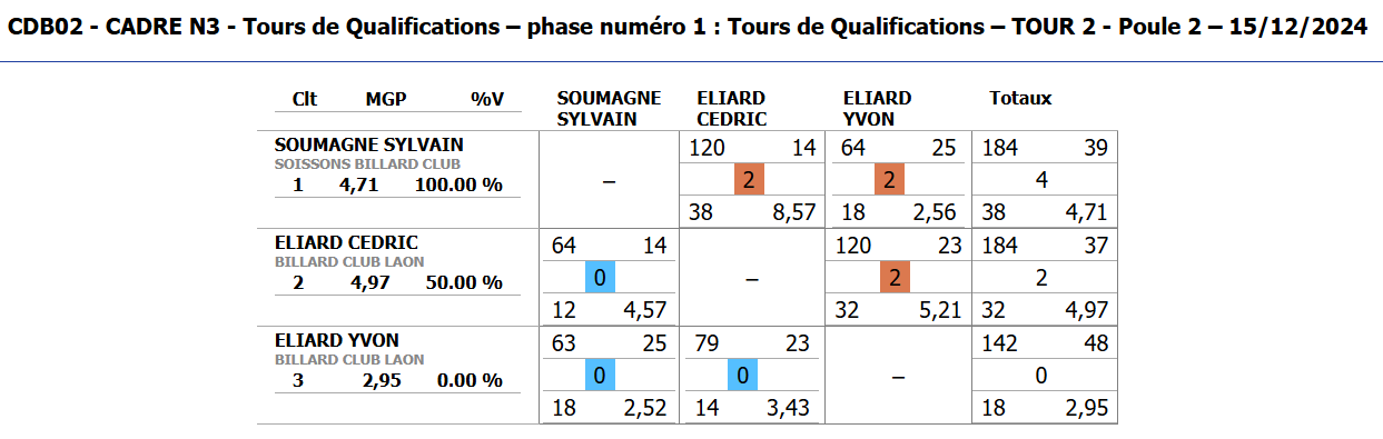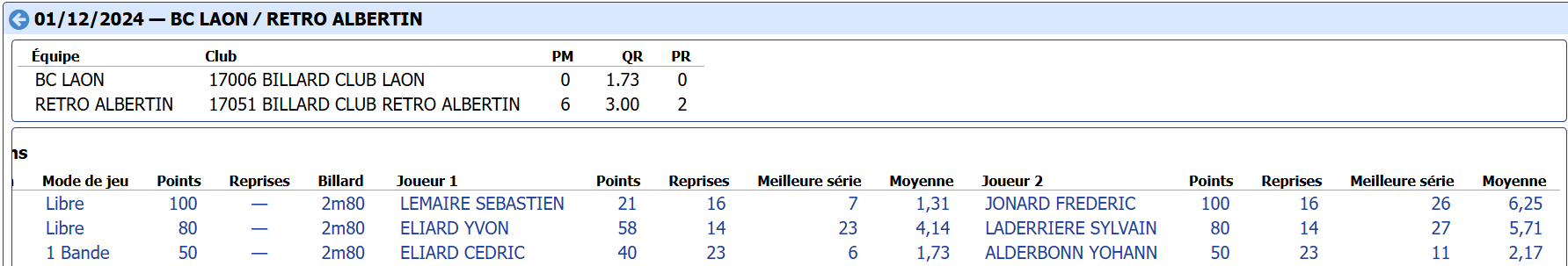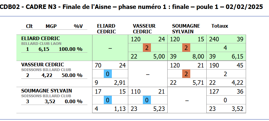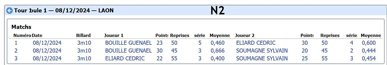Nouvelles Poster une nouvelle Finales Aisne au CADRE 2 février 2025 Cédric Champion Cadre Nat 3 à Soissons Sébastien Vice-Champion et Yvon 5eme en Reg à Laon Sebastien Champion LIBRE reg 1 à Laon Sébastien Champion de l'Aisne LIBRE Reg 1 Individuelles BANDE Toiur 2 du 19 janvier 2025 pour ce tour 2, Cédric (Nat 1) , Yvon (Nat 3) jouent à Laon CADRE qualifications tour 3 du 12 janvier 2025 Cédric à Noyon Yvon , Sébastien et Christophe à Laon LIBRE qualifications tour 3 du 4 janvier Yvon et Sébastien qualifiés Finale de l'Aisne Reg 1 le 26 janvier 2025 à Laon Christophe termine en force en Reg 3 joyeuses fêtes Individuelles CADRE 15 décembre Résultats Nat 3 Cédric et Yvon (surclassé) Soissons Individuelles 3 BANDES 8 décembre resultats Nat 2 Cédric - Nat 3 Yvon et Eric Par Equipe Jeux de Série CDF D4 1er Décembre LAON en Division 4 CDF en déplacement à Billy Montigny Défaite 0-6 Albert défaite 0-6 Billy Montigny Individuelles 5 Quilles 30 Novembre_resultats Nat Julien [ 1 2 3 4 5 6 7 8 9 10 ]