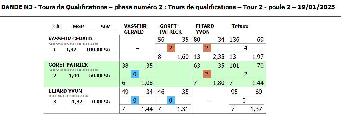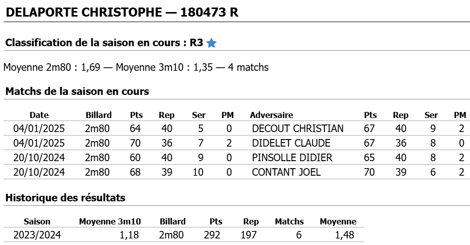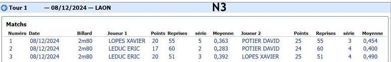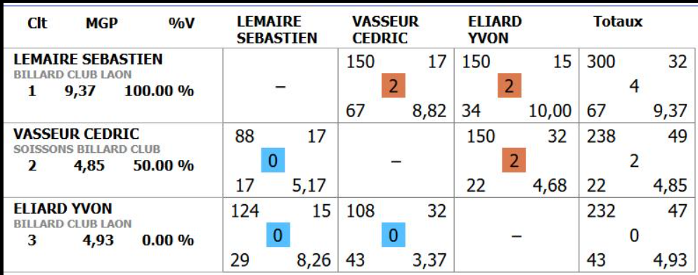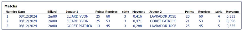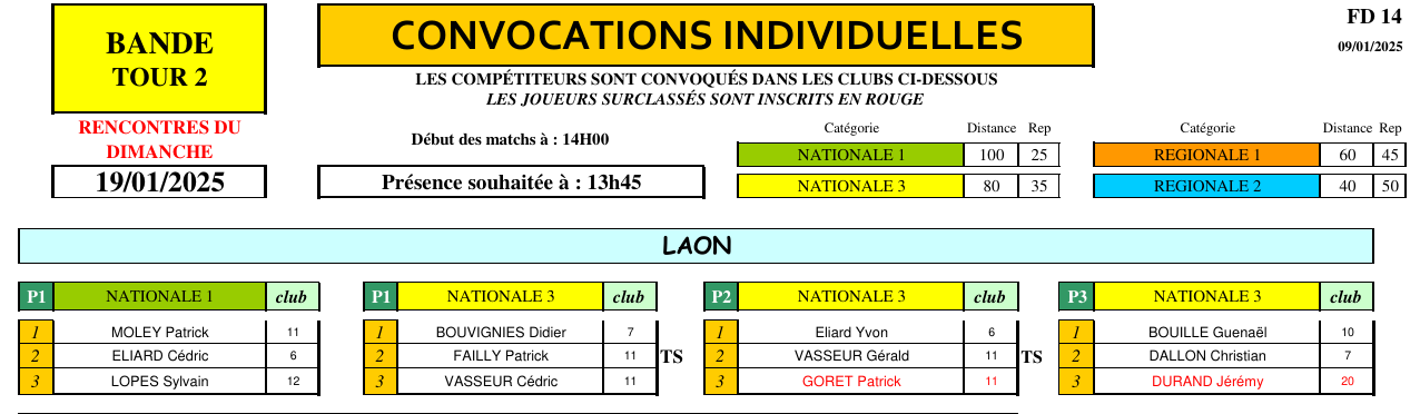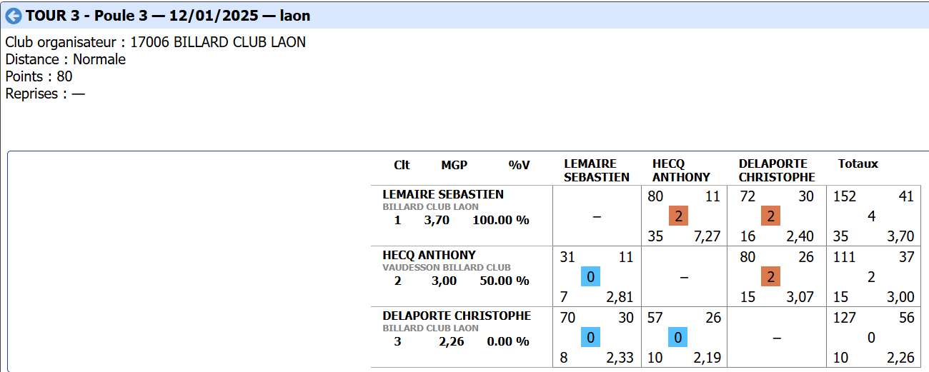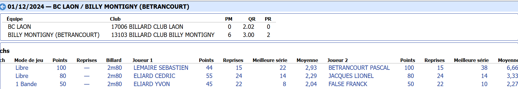 Nouvelles Poster une nouvelle Finales Aisne au CADRE 2 février 2025 Cédric Champion Cadre Nat 3 à Soissons Sébastien Vice-Champion et Yvon 5eme en Reg à Laon Sebastien Champion LIBRE reg 1 à Laon Sébastien Champion de l'Aisne LIBRE Reg 1 Individuelles BANDE Toiur 2 du 19 janvier 2025 pour ce tour 2, Cédric (Nat 1) , Yvon (Nat 3) jouent à Laon CADRE qualifications tour 3 du 12 janvier 2025 Cédric à Noyon Yvon , Sébastien et Christophe à Laon LIBRE qualifications tour 3 du 4 janvier Yvon et Sébastien qualifiés Finale de l'Aisne Reg 1 le 26 janvier 2025 à Laon Christophe termine en force en Reg 3 joyeuses fêtes Individuelles CADRE 15 décembre Résultats Nat 3 Cédric et Yvon (surclassé) Soissons Individuelles 3 BANDES 8 décembre resultats Nat 2 Cédric - Nat 3 Yvon et Eric Par Equipe Jeux de Série CDF D4 1er Décembre LAON en Division 4 CDF en déplacement à Billy Montigny Défaite 0-6 Albert défaite 0-6 Billy Montigny Individuelles 5 Quilles 30 Novembre_resultats Nat Julien [ 1 2 3 4 5 6 7 8 9 10 ]