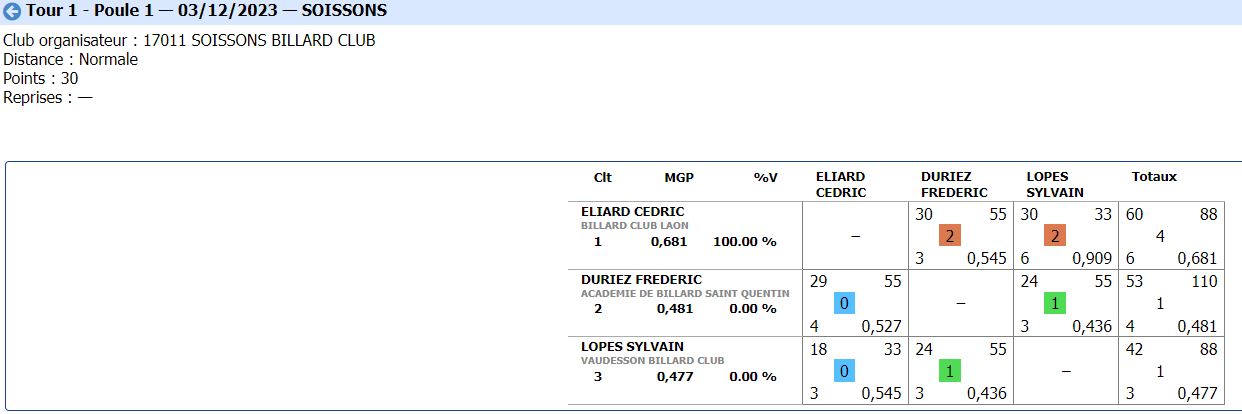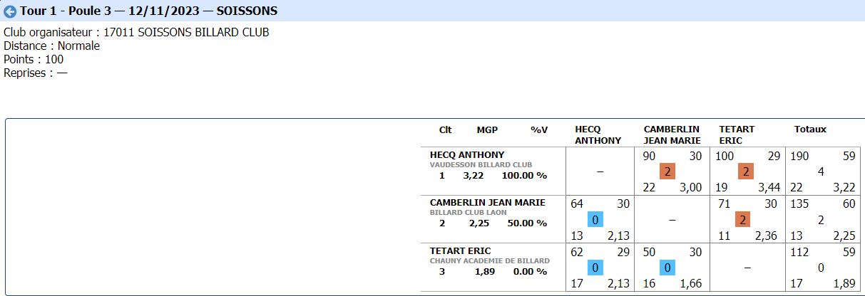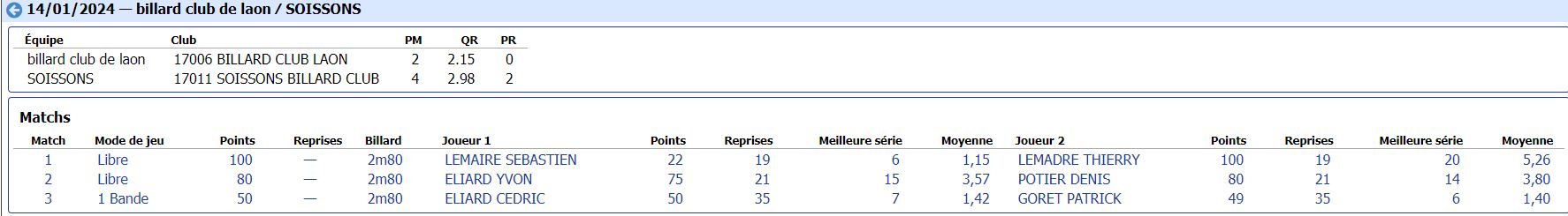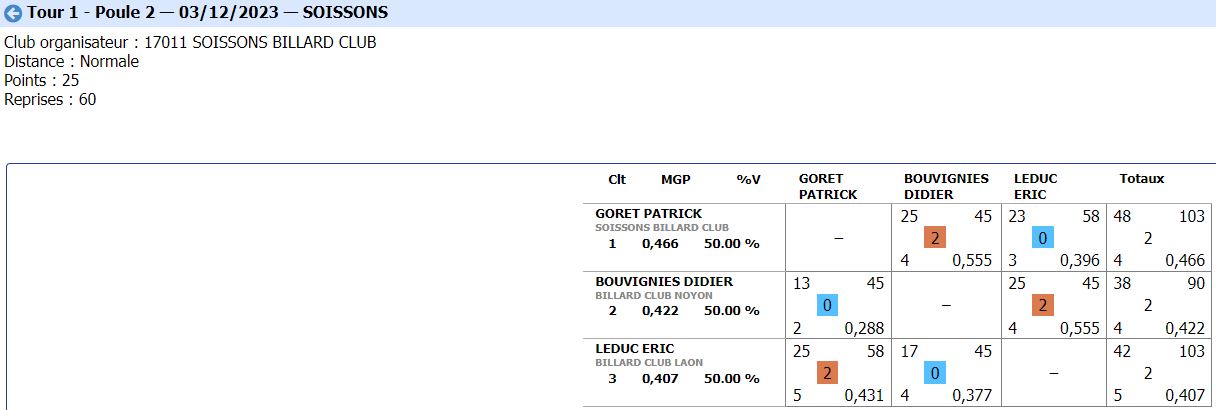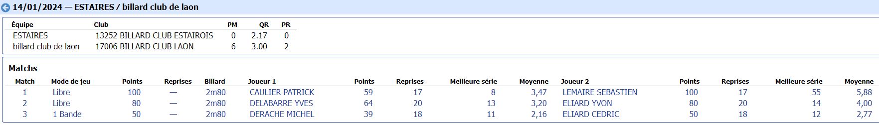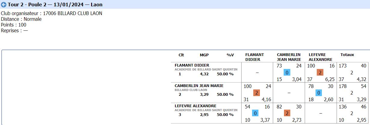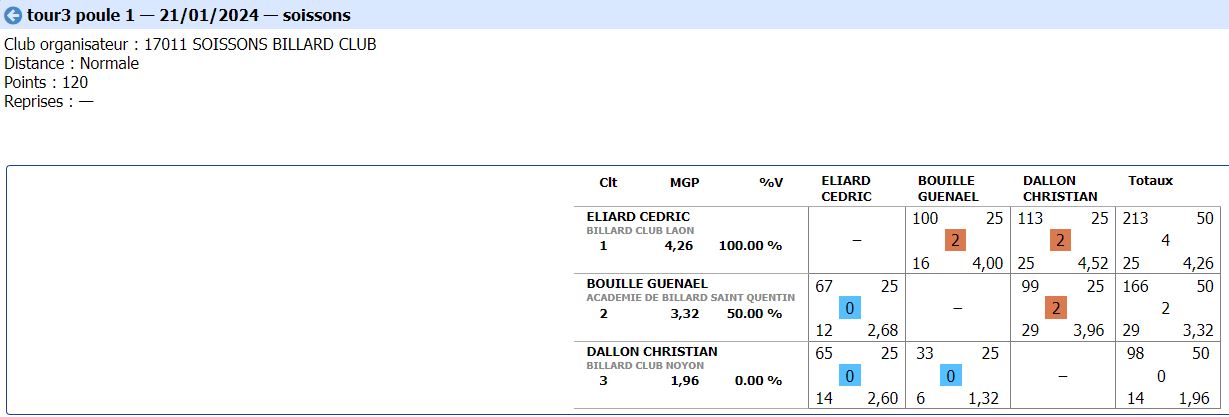 Nouvelles Poster une nouvelle CADRE Tour 3 du 21 janvier 2024 dimanche 21 janvier , Tour 3 au CADRE Cédric en Nat 3 , 2eme de la poule Yvon et Jean-Marie en Reg 1 , 2eme et 4eme poule tous les 3 en Finales District le 11 février 2024 Soissons (Nat3) et Noyon (Reg1) CDF JDS tour 3 du 14 janvier dimanche 14 janvier , Tour 3 CDFrance Jeux de Série Division 4 LAON bat ESTAIRES 6-0 et perd SOISSONS 2-4 LIBRE Tour 2 du 13 janvier 2024 samedi 13 janvier ,Tour 2 à la LIBRE Yvon et Sébastien 2 victoires Jean-Marie 1 victoire et Christophe en Reg 2 CDF JDS tour 2 du 17 décembre dimanche 17 décembre , Tour CDFrance Jeux de Série Division 4 BANDE Tour 2 du 16 décembre samedi 16 décembre , 2 eme Tour à la BANDE Cédric à Laon en Nat 3 Yvon et Jean-Marie à Soissons en Reg 1 Tour 2 - 16 décembre - 5 Quilles Tour 1 du 25 novembre Tour 1 - 25 novembre 2023 - Tour 2 - 20 janvier 2024 CADRE Tour 2 du 10 décembre 10 décembre , Tour 2 au CADRE Cédric Yvon et Jean-Marie chacun 2 victoires bravo ! 3 bandes Tour 1 du 3 décembre 2023 3 décembre , 1er Tour au 3 bandes Cédric en Nat 2, Eric et Jean-Marie en Nat 3 CDF 3BANDES Tour 2 du 26 novembre 2023 dimanche 26 novembre , 2emeTour CDFrance 3 Bandes Division 4 LIBRE Tour 1 du 12 novembre 2023 12 novembre , 1er Tour à la LIBRE Cédric en Nat 3, Yvon et Sébastien en Reg 1 Jean-Marie en Reg 2 Christophe en Reg 3 [ 1 2 3 4 5 6 7 8 9 10 ]