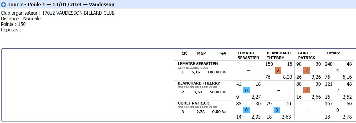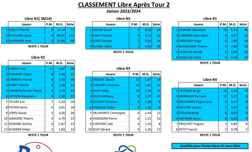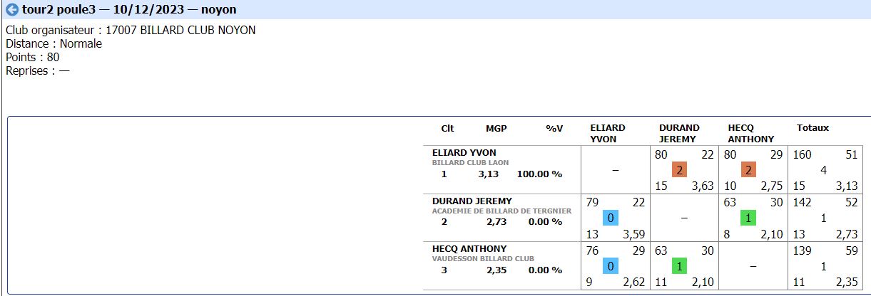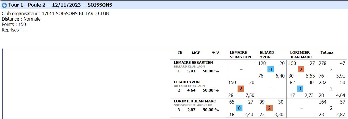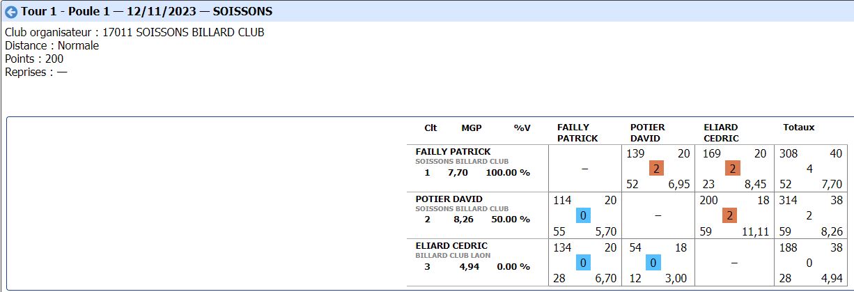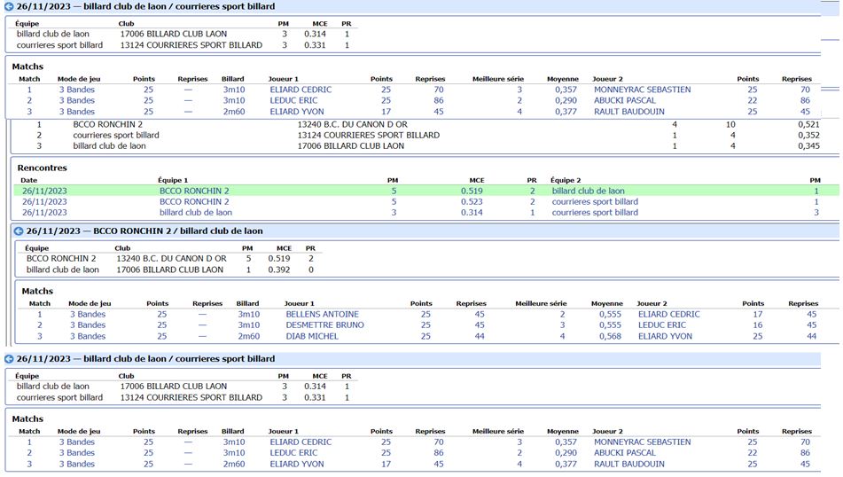 Nouvelles Poster une nouvelle CADRE Tour 3 du 21 janvier 2024 dimanche 21 janvier , Tour 3 au CADRE Cédric en Nat 3 , 2eme de la poule Yvon et Jean-Marie en Reg 1 , 2eme et 4eme poule tous les 3 en Finales District le 11 février 2024 Soissons (Nat3) et Noyon (Reg1) CDF JDS tour 3 du 14 janvier dimanche 14 janvier , Tour 3 CDFrance Jeux de Série Division 4 LAON bat ESTAIRES 6-0 et perd SOISSONS 2-4 LIBRE Tour 2 du 13 janvier 2024 samedi 13 janvier ,Tour 2 à la LIBRE Yvon et Sébastien 2 victoires Jean-Marie 1 victoire et Christophe en Reg 2 CDF JDS tour 2 du 17 décembre dimanche 17 décembre , Tour CDFrance Jeux de Série Division 4 BANDE Tour 2 du 16 décembre samedi 16 décembre , 2 eme Tour à la BANDE Cédric à Laon en Nat 3 Yvon et Jean-Marie à Soissons en Reg 1 Tour 2 - 16 décembre - 5 Quilles Tour 1 du 25 novembre Tour 1 - 25 novembre 2023 - Tour 2 - 20 janvier 2024 CADRE Tour 2 du 10 décembre 10 décembre , Tour 2 au CADRE Cédric Yvon et Jean-Marie chacun 2 victoires bravo ! 3 bandes Tour 1 du 3 décembre 2023 3 décembre , 1er Tour au 3 bandes Cédric en Nat 2, Eric et Jean-Marie en Nat 3 CDF 3BANDES Tour 2 du 26 novembre 2023 dimanche 26 novembre , 2emeTour CDFrance 3 Bandes Division 4 LIBRE Tour 1 du 12 novembre 2023 12 novembre , 1er Tour à la LIBRE Cédric en Nat 3, Yvon et Sébastien en Reg 1 Jean-Marie en Reg 2 Christophe en Reg 3 [ 1 2 3 4 5 6 7 8 9 10 ]